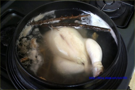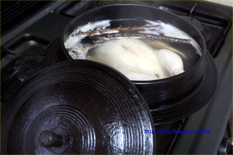 5.큰 솥에 영계를 담고 푹 잠길 정도로 물을 넉넉히 부은 뒤 끓인다.